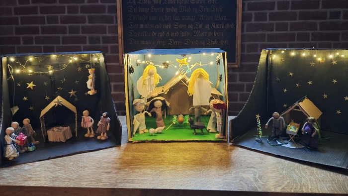 Der er kirkekaffe og fernisering af konfirmandernes julekrybber efter gudstjenesten.